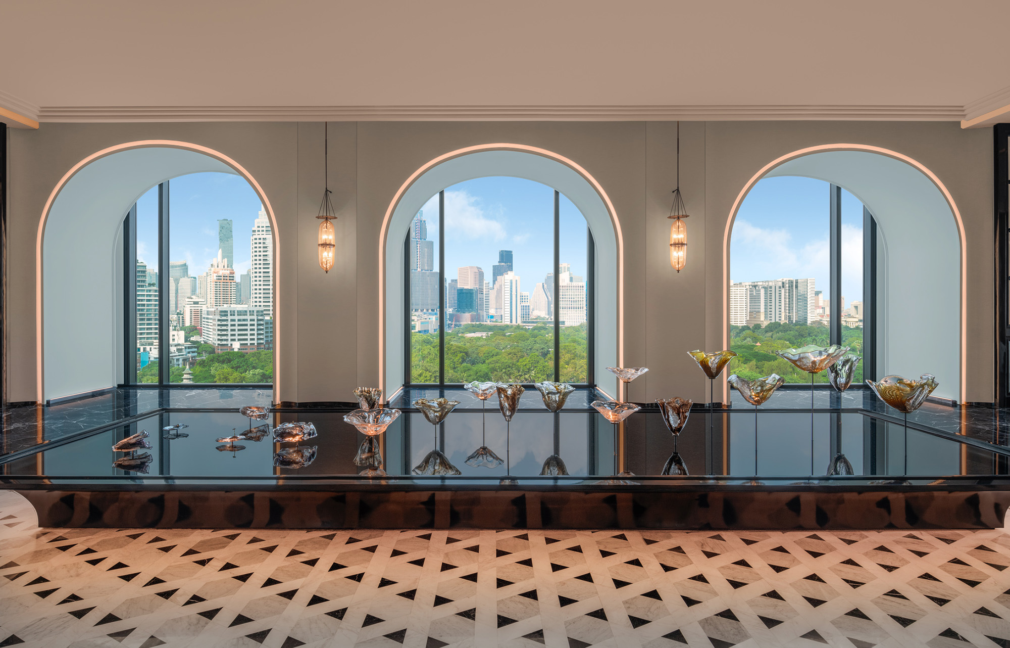 Tout en clins d’œil artistiques et subtils à sa ville, le Ritz-Carlton Bangkok est un hôtel qui cultive un sens certain du luxe. Matières et couleurs précieuses donnent le ton à l’instar de cet étang de lotus en verre soufflé qui accueille le visiteur à la sortie de l’ascenseur — dans la philosophie bouddhiste, une marre à lotus postée devant sa maison est une façon de souhaiter la bienvenue à ses visiteurs. Sans donc besoin de mots, cette œuvre sensible nous rappelle à chacune de nos allées et venues qu’on est ici chez nous, avec pour toile de son la skyline de la ville — ce lobby est au 16e étage.
