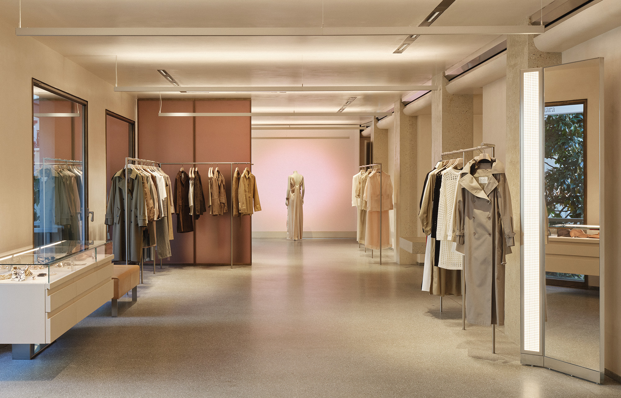 Un dispositif digital discret prolonge cette immersion. Un écran rétroéclairé diffuse en temps réel les conditions météorologiques de Reggio Emilia, berceau de Max Mara. « C’est une façon subtile de raconter l’histoire de la marque », explique l’architecte. Vent, brume ou soleil modulent ainsi les images de l’usine historique dans une composition abstraite.